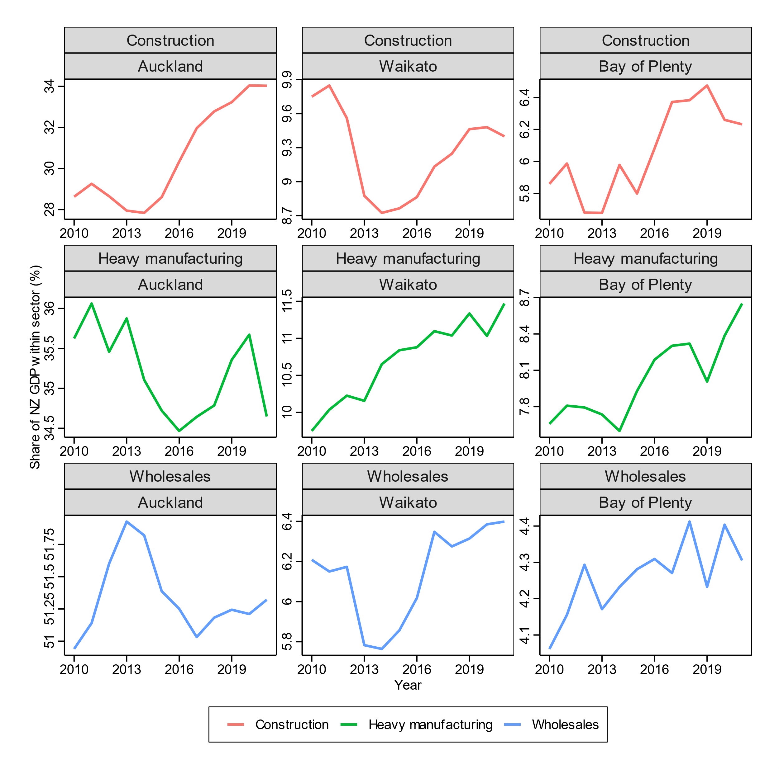 Figure 10 shows the changes in the share of the national GDP of wholesales, heavy manufacturing and construction sectors for Auckland, Waikato and Bay of Plenty (BoP). The figures show data between 2010 (before any of the Expressway was completed) until 2021 (after completion of all phases except for the last phase between Lake Road Interchange and Tamahere). Accordingly, the share of Waikato and BoP of the national GDP of relevant industries has increased over the last few years (the percentage changes are small, but there is a consistent trend). This includes the increases in shares of the wholesale, heavy manufacturing and construction sectors.