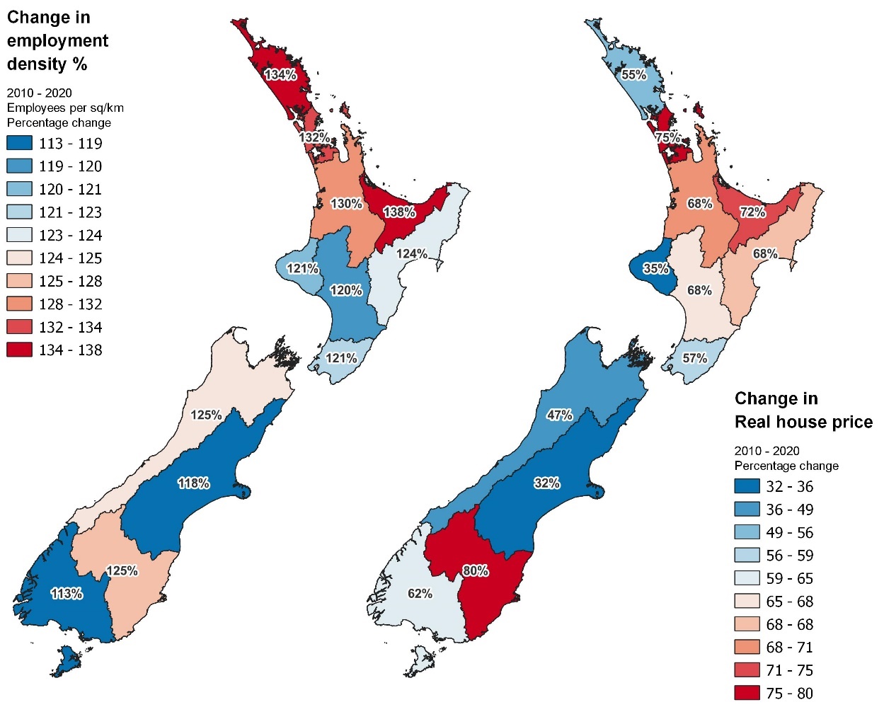 Note: We use employment data from the Statistics NZ Household Labour Force survey and calculate the employment densities using regional land areas reported in Statistics NZ geographic boundaries files. We amalgamate areas to match those reported by REINZ for house prices to allow for comparisons.