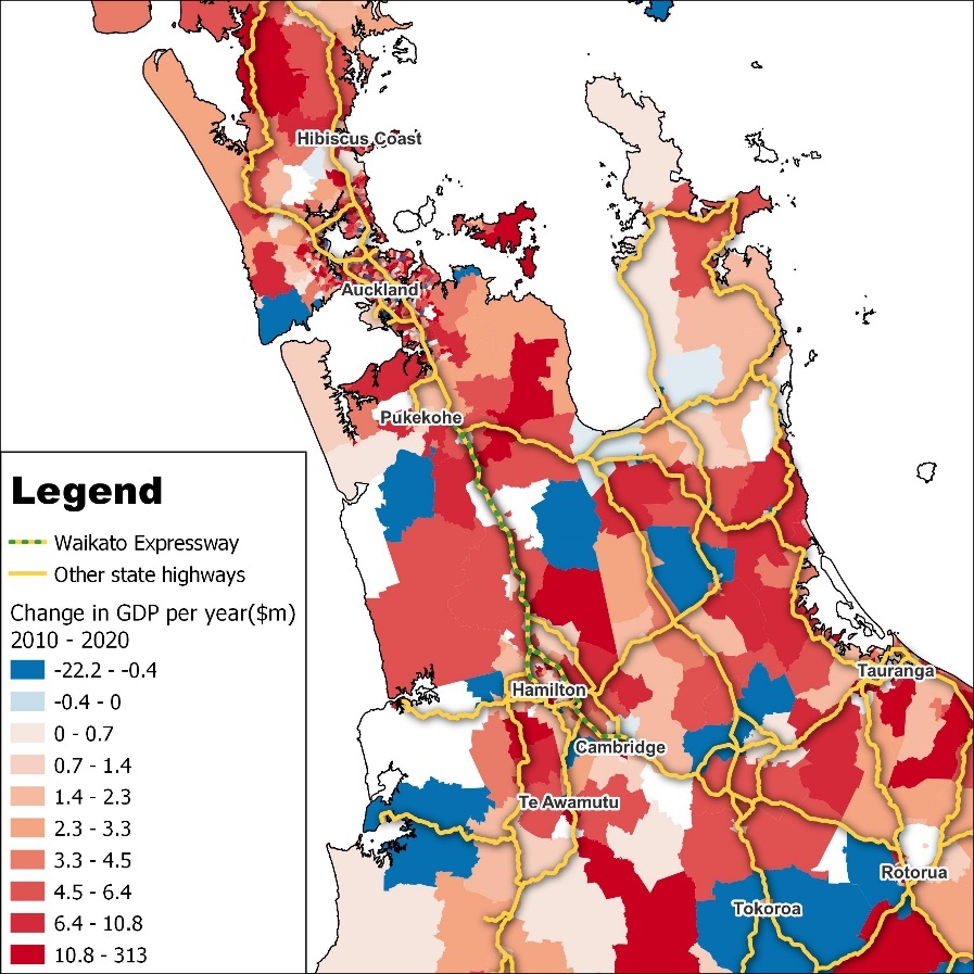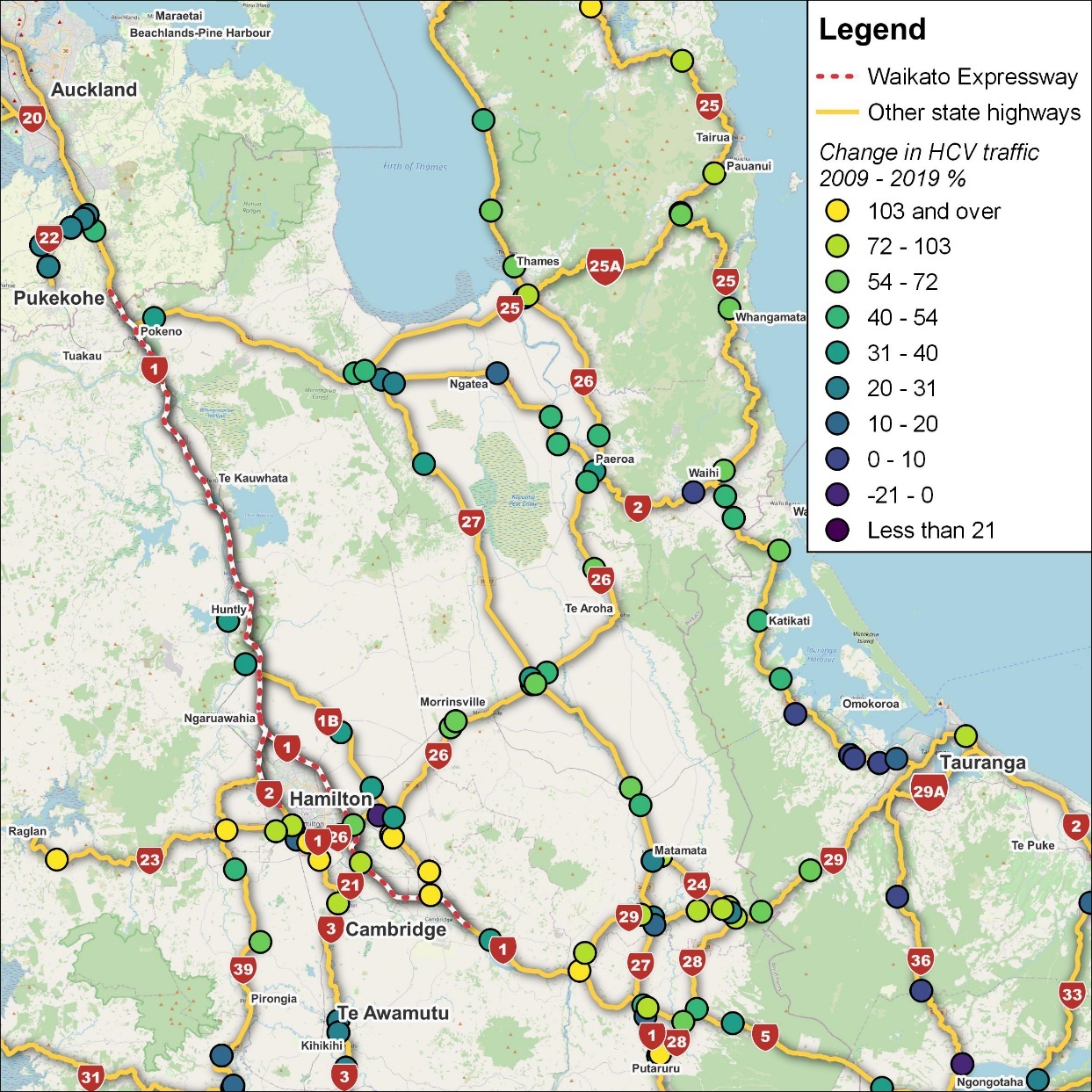 Figure 9 shows the implication of the expressway for HCVs along the planned Expressway is shown in. Accordingly, we observe a significant increase in HCV around Hamilton and between Hamilton and Tauranga. In comparison, the percentage change in HCV is small and even negative in lower parts (closer to Tauranga). This confirms our initial suggestion that while SH2 is shorter, the reliability and safety of the Expressway has led to increased use of HCV of the Expressway.