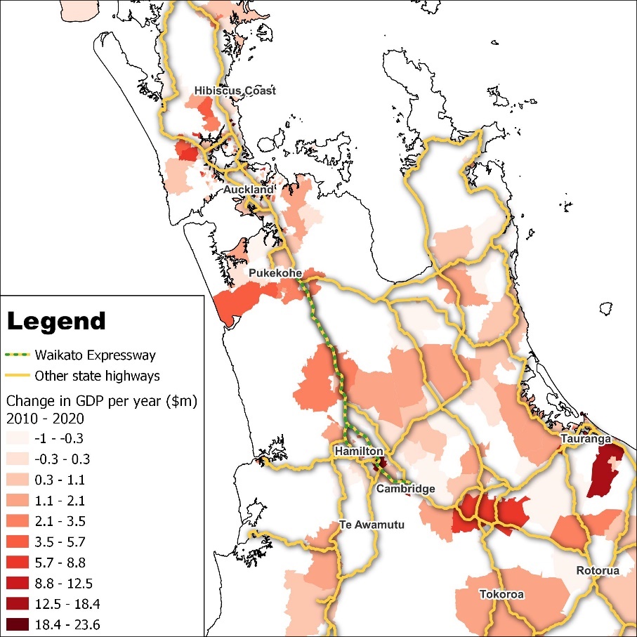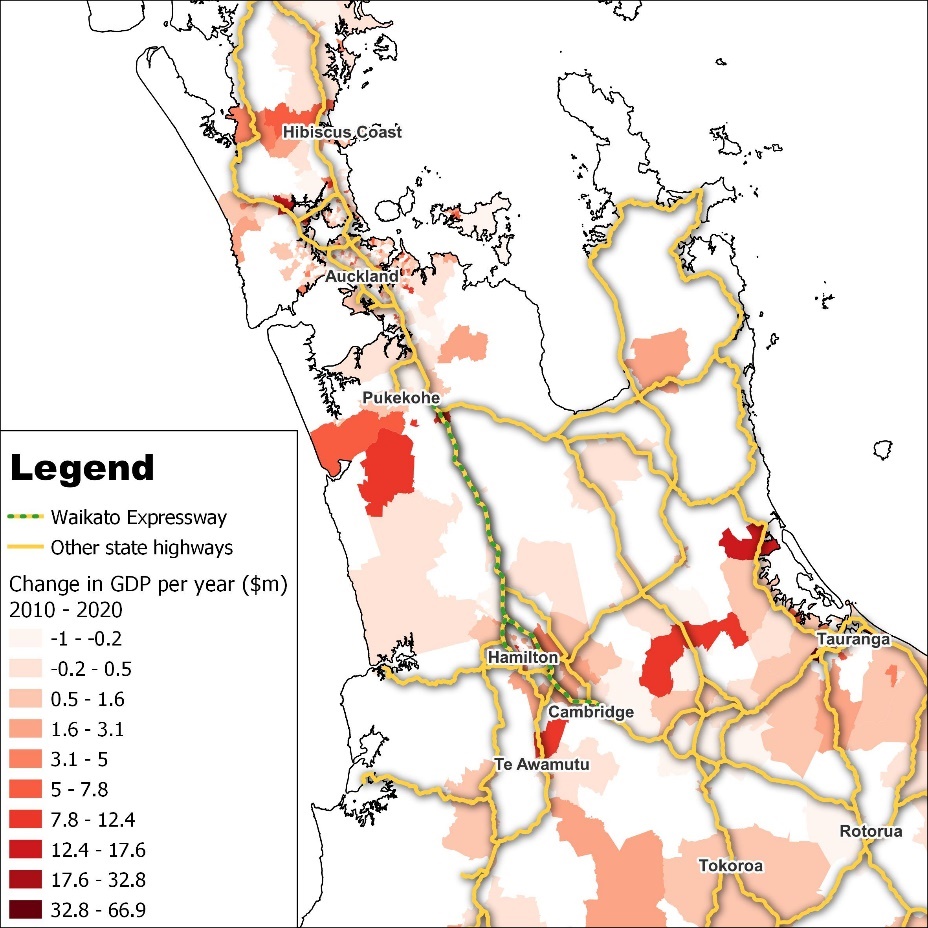 Infometrics (2009, 2010) provided an economic impact assessment of the roads of national significance (RoNS), including the Waikato Expressway, the Auckland Western Ring Route, Tauranga’s Eastern Link, the Puhoi to Wellsford Motorway, the Victoria Park Tunnel, the Christchurch By-pass, and Wellington to Foxton at a national level. The reports capture the efficiency gains and corresponding capital accumulation from the RoNS investments. The results suggest that the $2.65 billion investment in RoNS (SAHA, 2010, p. 42) raised annual GDP by $1.4 billion (expressed in 2008 prices).