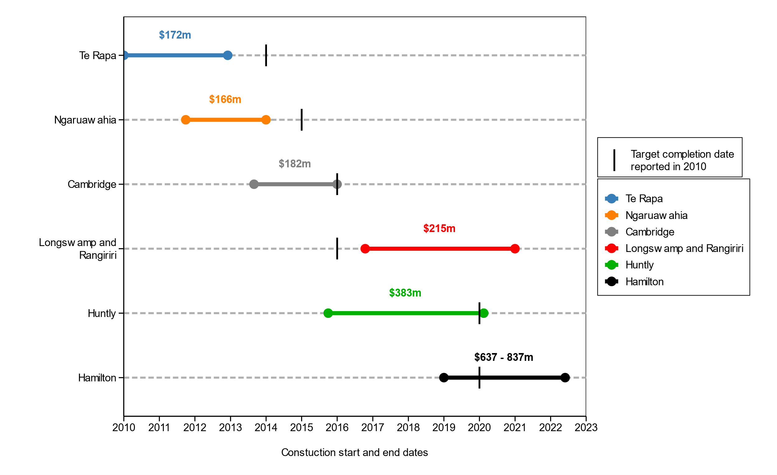 The discussions around improving mobility between the Auckland and Waikato regions date back to 1970s, when the initial suggestions were made regarding extensions to State Highway 1. This idea evolved until early 2000s and led to the idea of the Waikato Expressway. While there is always a level of uncertainty involved and further planning is required to address that, there is a large gap of almost 40 years between the initiation of the idea and start of the project in 2009.14 This phase included both the project initiation and the planning phases.