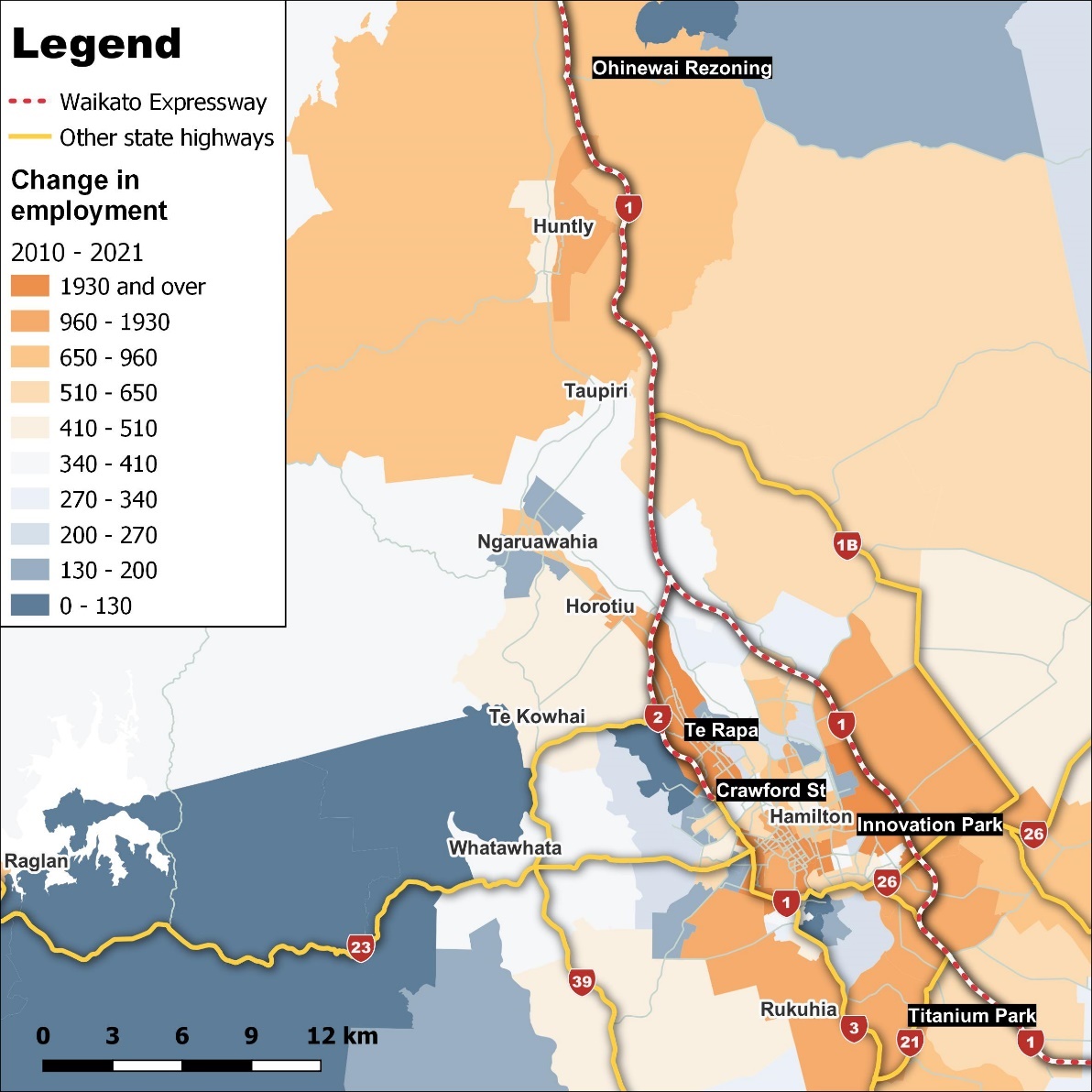 The Expressway leads to improved commercial and industrial developments. This includes developments in the Te Rapa district north-west of Hamilton in Horotiu to the north of Te Rapa, the ‘Innovation Park’ in East Hamilton, at ‘Titanium Park’ near Hamilton airport, and at Crawford Street Rail Village. An example of a development that occurred as a result of the Expressway is the $1 billion development in Ohinewai (north Waikato) by Comfort Group, which is a mixed-use development consisting of 1,100 homes for up to 3,000 residents and a new factory with an estimated 2,600 jobs.20 The locations and change in employment between 2010 and 2021 are shown in Figure 8.