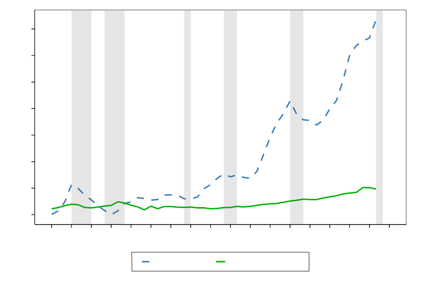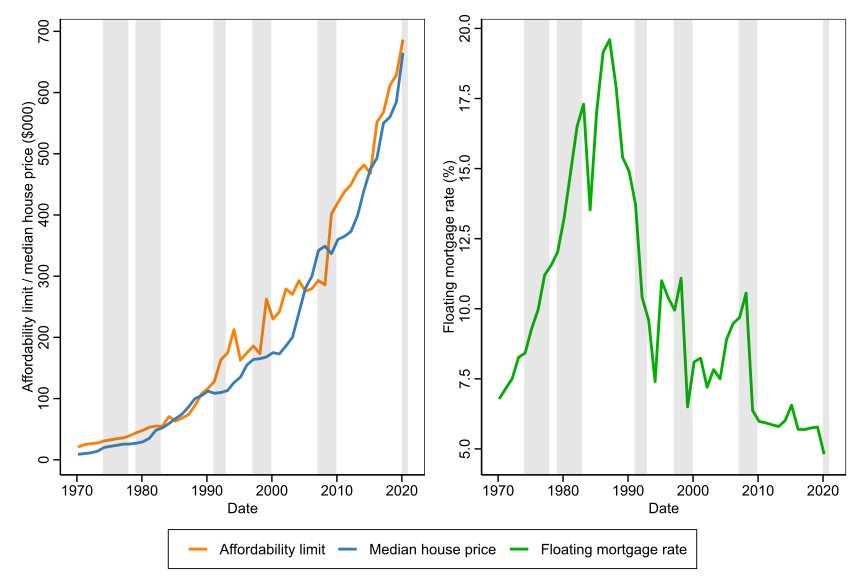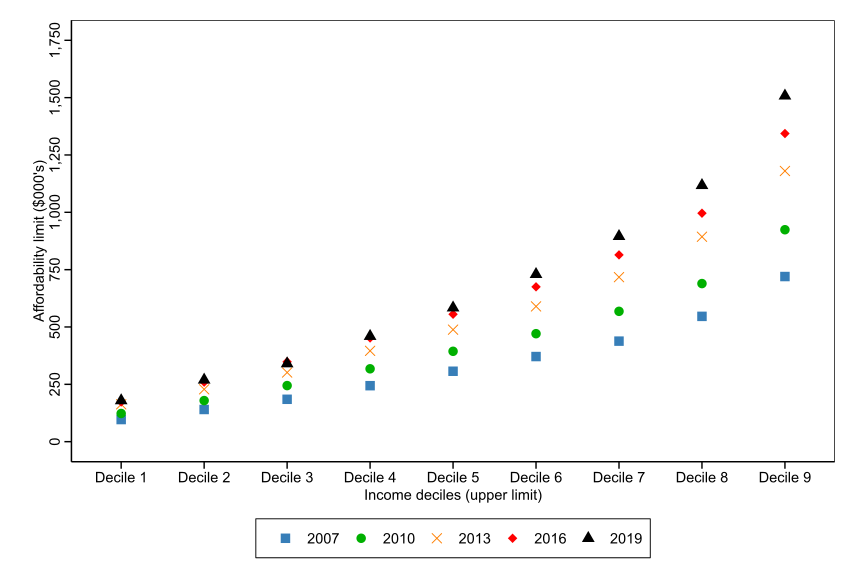 11. Our housing affordability simulation model also accounts for likely wealth levels and the loan to value ratio. However, since our information on wealth does not go back to 1970s, we have excluded wealth levels from the affordability limit illustrated in this figure↩︎