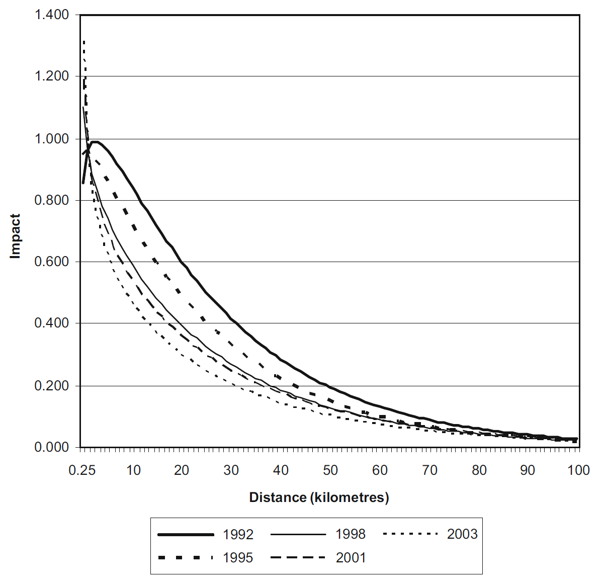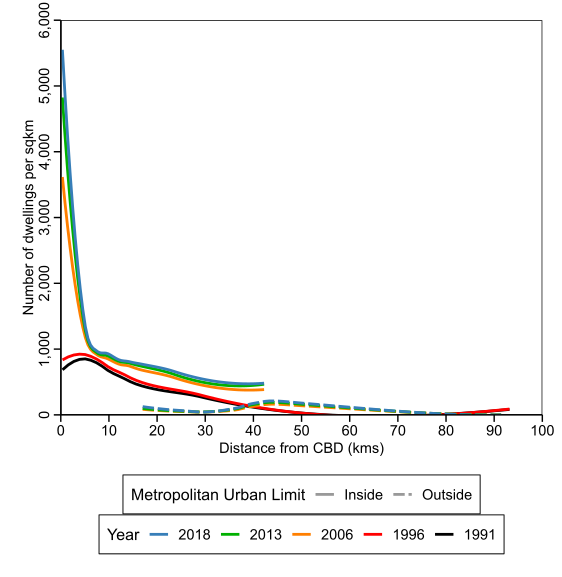 46. They also compared the estimated impacts of distance on land prices and number of dwellings per hectare and the results suggested the same high level of correlation between the impacts↩︎