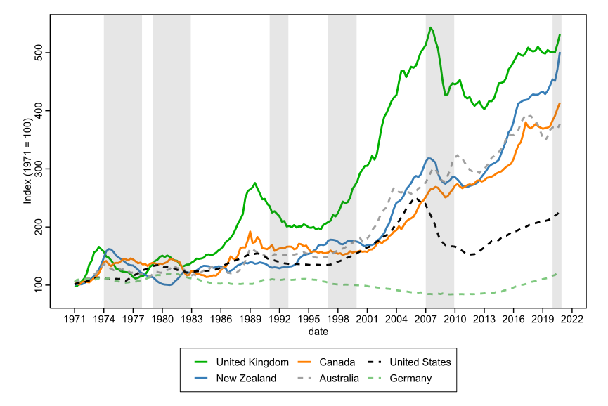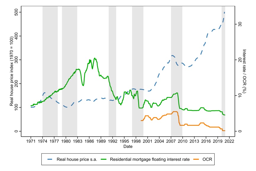 5. We index the seasonally adjusted rental prices and house prices and the CPI to the initial starting period to determine the magnitude of change over the last fifty years. We have sourced the historical data for index from Bank for International Settlements who in turn sourced this information from RBNZ (and in turn from Quotable Value Limited, as the Core Logic House Price Index previously known as the QV House Price Index). We have not directly sourced this information from RBNZ as at the time of writing this report, this information is not provided publicly on the RBNZ website. Details on the methodology used to determine the series can be found at https://www.rbnz.govt.nz/statistics/key-graphs/qv-quarterly-house-price-index.↩︎
