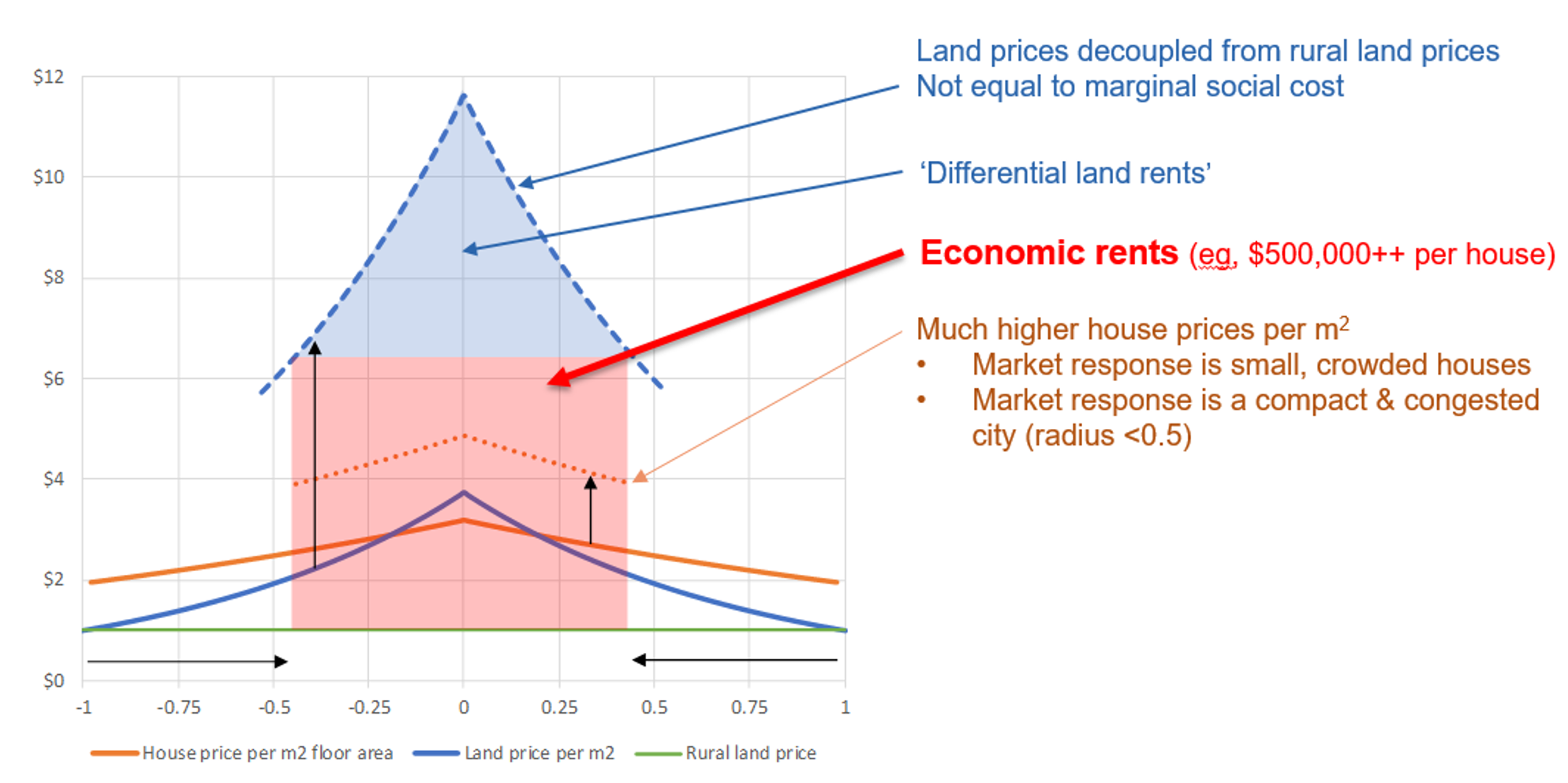 13. This is based on an assumption of housing being a homogenous good. In practice, the features of land and housing are often unique to each parcel/house and that leads to a price premium for the scarce features↩︎