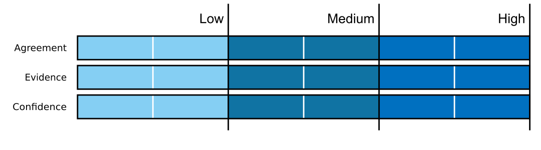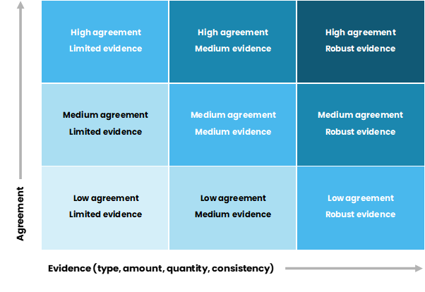 After finding the relevant studies, we assess each chosen topic against the IPCC’s uncertainty framework (IPCC, 2010). To do this, we highlight the methodological quality of the studies (research design). We prioritise using the highest quality well implemented research designs in our review.3 The output of IPCC’s uncertainty framework is illustrated in Figure 1.